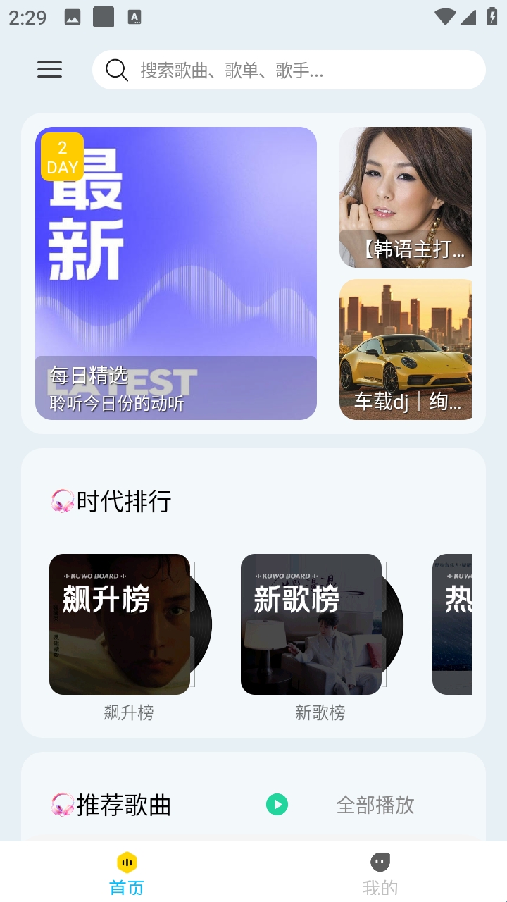 1、打开晓晓音乐App,在首页可以看到每日精选、歌曲榜单等栏目