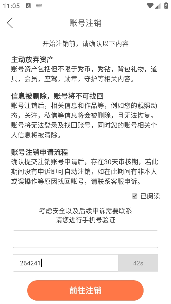 5、填写手机号后,输入获取的验证码,最后点击【前往注销】即可