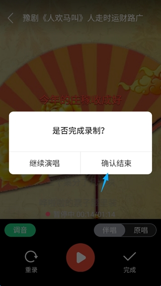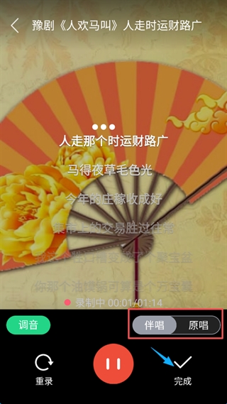 4、录制时,可以自行选择是否有原唱,完成后,点击屏幕游戏角的“完成”。