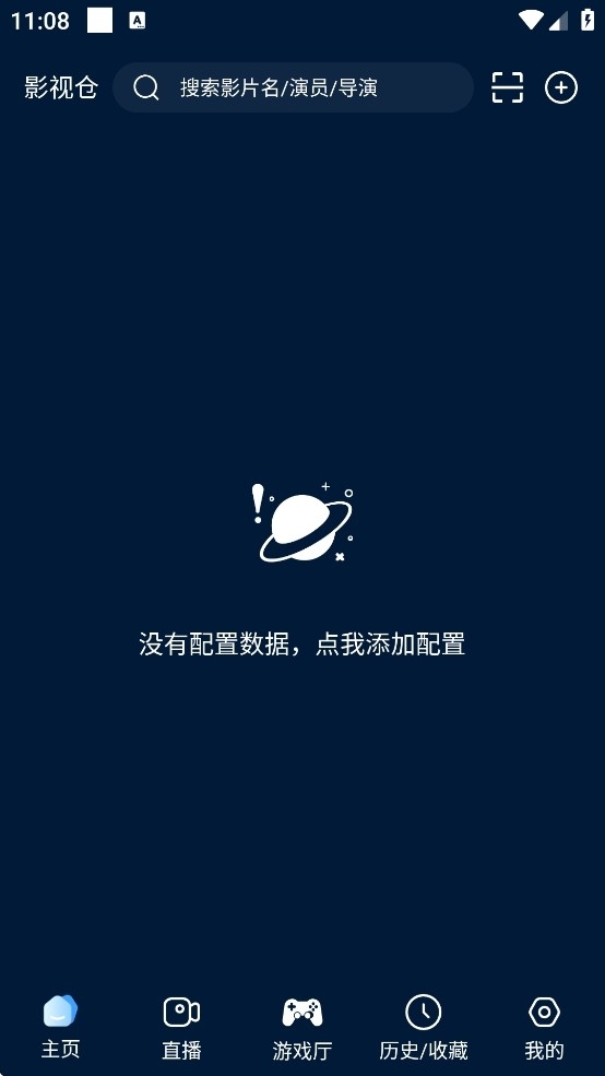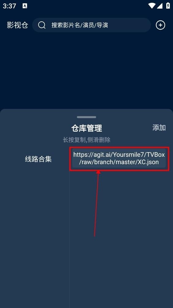 1、打开影视仓软件后,点击顶部的+号按钮,然后选择“添加”选项,如图所示: