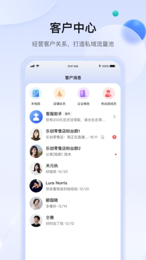 乐创商家版是一款店铺运营软件,一站式快速的高效的商家店铺管理,专业的客户中心,经营客户关系,打造私域流量池,一键快速的店铺中心,便捷店铺管理,无门槛带货直播,专业的营销中心,商家专属方案,一站式精致经营,店铺中心一站式管理,非常好用。