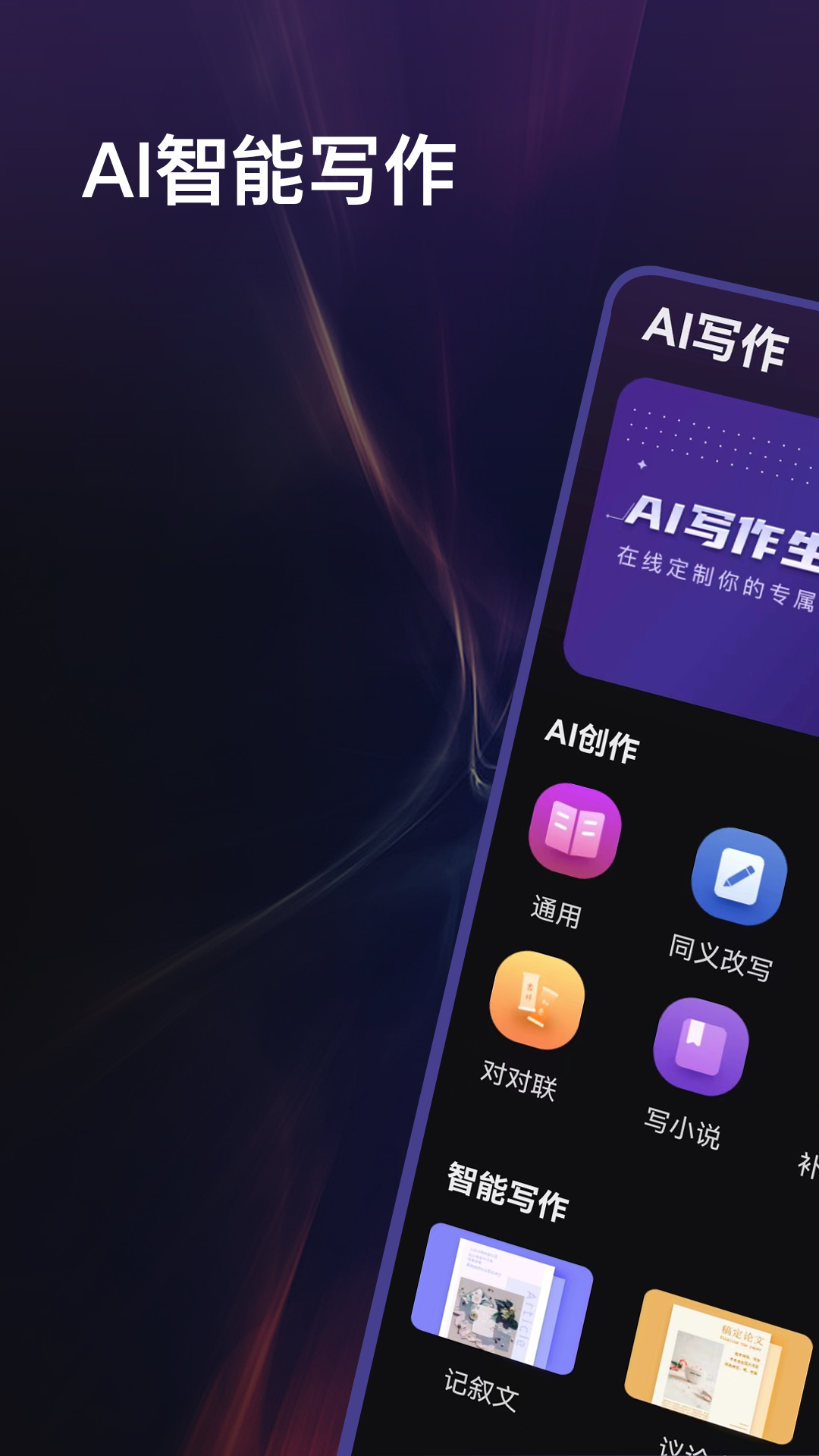 3.不止可以聊天,还可以快速的进行AI写作,通用的功能都可以查看,一键快速写小说,写作文都可以。
