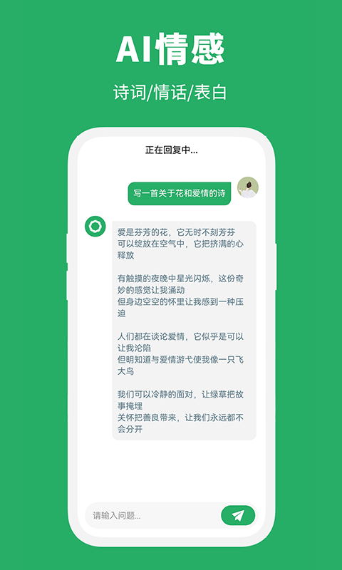 3.满足所有用户的AI使用需求,一键AI表白,让智能机器人进行诗词、情话、表白,支持多种的聊天模式。