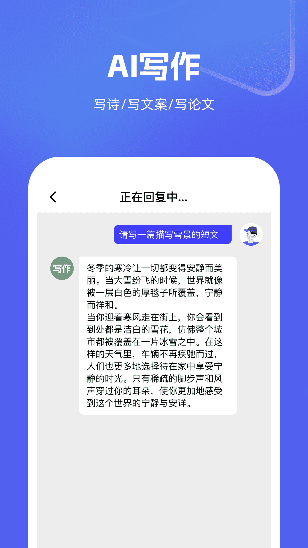 2.给你最好的AI写作体验,用户无聊还可以一键快速的进行AI聊天,非常有趣,专业的AI写作软件。